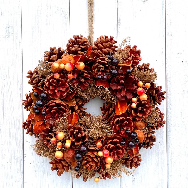 木の実が可愛らしいアクセントとなっているナチュラルリースです。 緑の草木はアーティフィシャルフラワー(造花)なので、長く飾ることができます。 緑々しく、全体的に爽やかさがあるオールシーズンリースです。 「Quelle joie(訳:とても幸せ)」プレートが付いております(取り外し可能)。 品番:WR-63-A サイズ:Lサイズ(直径約32cm、厚み約6.5cm) ↓オプション「リーススタンド(ホワイト/ダークブラウン)」の詳細は下記をご覧ください ↓ https://mamawreath.base.shop/items/58385218 ※フラワーリースは自然素材を多く用いております。そのため、多少の個体差がございます。 アーティフィシャルフラワー(造花)や乾燥させた草木が付いております。 パーツが取れた際には、ボンドやグルーガンで補修頂ければ幸いです。 土台は、発泡スチロールです。 クラフトボックスやプレートは、デザインが変更になる場合がございます。 ※実店舗では品切れの場合がございます。実店舗の在庫状況につきましては、浦和店(048-767-3618)パルコヤ上野店(080-7567-8375)まで直接お問い合わせくださいませ。 ※配送は、日本郵便の「ゆうパック(一般料金)」となります。在庫状況によって「佐川急便」に変更される場合がございます。予めご了承ください。 伝票の記載につきまして、お届け先のお名前とご購入者様のお名前が同一の場合、差出人(ご依頼主欄)は「mamawreath」とさせていただきます。 同一でない場合は、差出人欄はご購入者様のお名前とご住所を記載させていただきます。 ※納品書は、基本同封しておりません。必要な方はご注文時に備考欄にお気軽にご要望くださいませ。 ※発送時の梱包写真はリースを1点のみご購入いただいた場合です。 商品を複数ご購入の場合、発送時の梱包方法が写真と異なります。