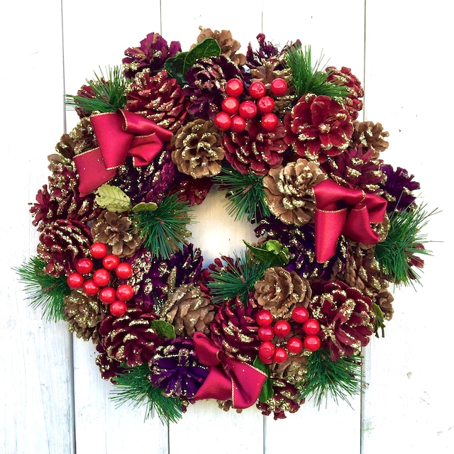 深い色味の赤や紫の大きな松ぼっくりがゴールドのラメと共に輝き、落ち着いた色味ながらも華やかで大人っぽいクリスマスリースです。 品番:CGX-307M サイズ:Lサイズ(直径約32cm、厚み約7cm) ↓オプション「リーススタンド(ホワイト/ダークブラウン)」の詳細は下記をご覧ください ↓ https://mamawreath.base.shop/items/58385218 ※フラワーリースは自然素材を多く用いております。そのため、多少の個体差がございます。 松ぼっくりや造花の松、リボン、乾燥させた草木が付いております。 全体的にゴールドのラメが付いておりますが、多い少ない等の個体差がございます。 また、飾りつけの際に、多少パラパラと落ちますので、ご注意くださいませ。 パーツが取れた際には、ボンドやグルーガンで補修頂ければ幸いです。 土台は、発泡スチロールです。 クラフトボックスは、デザインが変更になる場合がございます。 ※実店舗では品切れの場合がございます。実店舗の在庫状況につきましては、浦和店(048-767-3618)パルコヤ上野店(080-7567-8375)まで直接お問い合わせくださいませ。 ※配送は、日本郵便の「ゆうパック(一般料金)」となります。在庫状況によって「佐川急便」に変更される場合がございます。予めご了承ください。 伝票の記載につきまして、お届け先のお名前とご購入者様のお名前が同一の場合、差出人(ご依頼主欄)は「mamawreath」とさせていただきます。 同一でない場合は、差出人欄はご購入者様のお名前とご住所を記載させていただきます。 ※納品書は、基本同封しておりません。必要な方はご注文時に備考欄にお気軽にご要望くださいませ。 ※発送時の梱包写真はリースを1点のみご購入いただいた場合です。 商品を複数ご購入の場合、発送時の梱包方法が写真と異なります。
