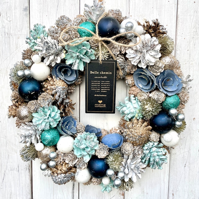 クリスマスリース シルバーラメ ブルー クリスマスボール 松ぼっくり ナチュラルリース 冬 フラワーリース ドライフラワー 青色 水色 【WR-54-B】