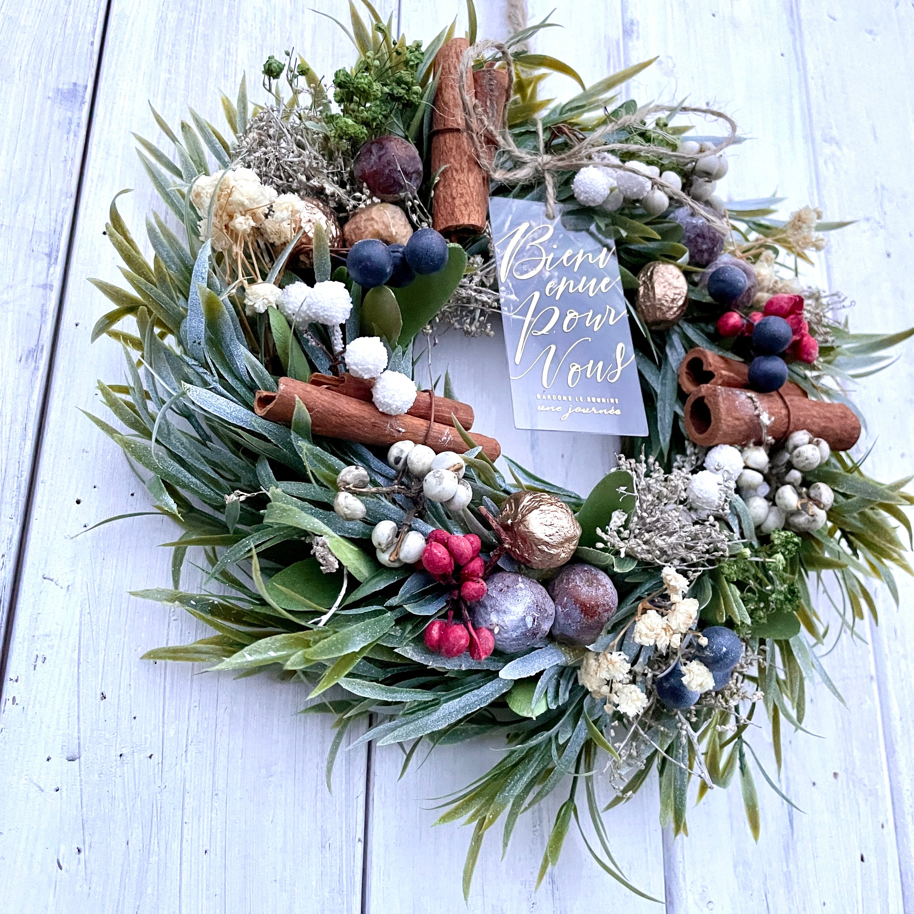 木の実やシナモンが可愛らしいアクセントとなっているナチュラルリースです。
