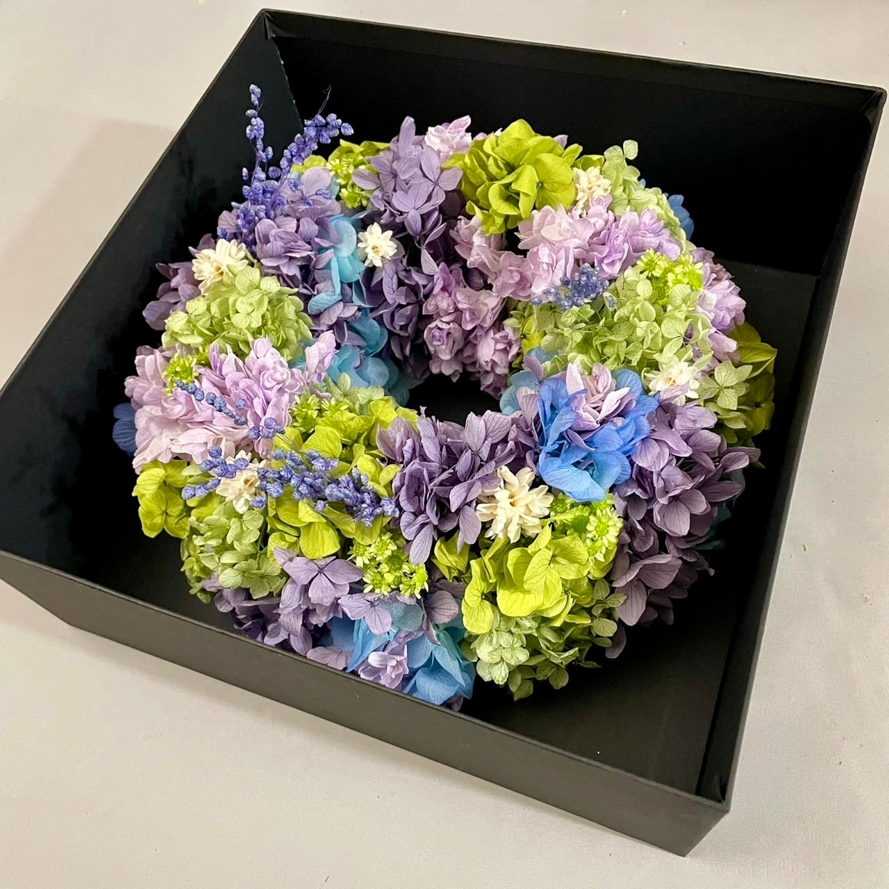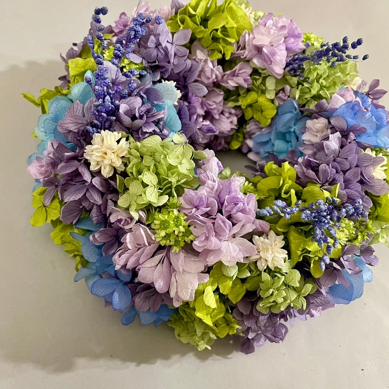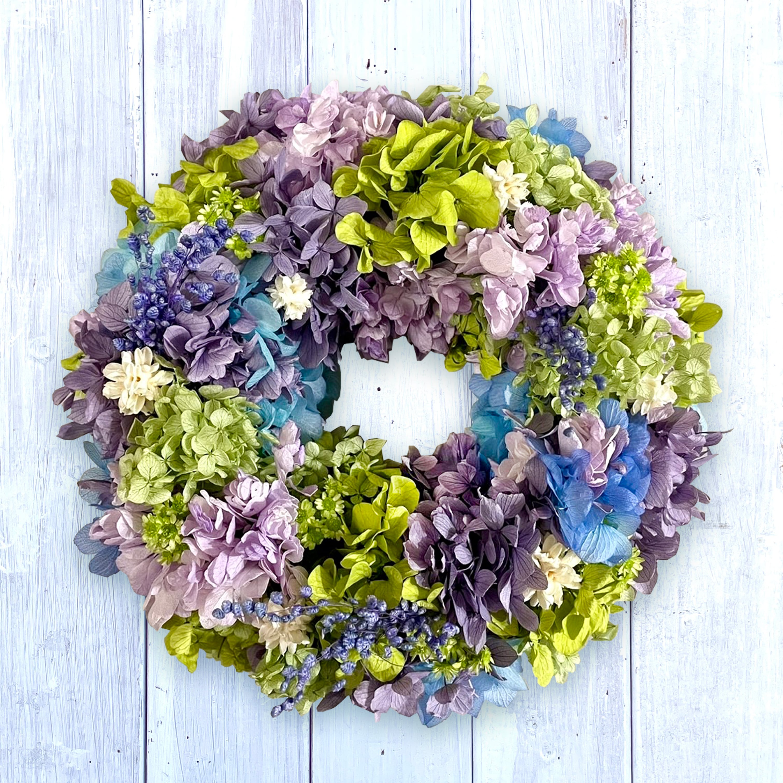 プリザーブドフラワーを多く使用したナチュラルな緑色と紫と青色のリースです。
