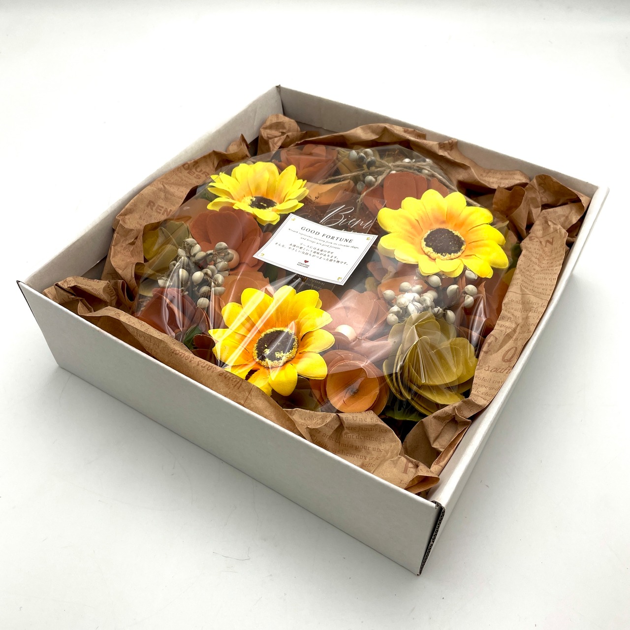 落ち着いたくすみイエローカラーとヒマワリが派手すぎず、元気いっぱいの雰囲気があるリースです。