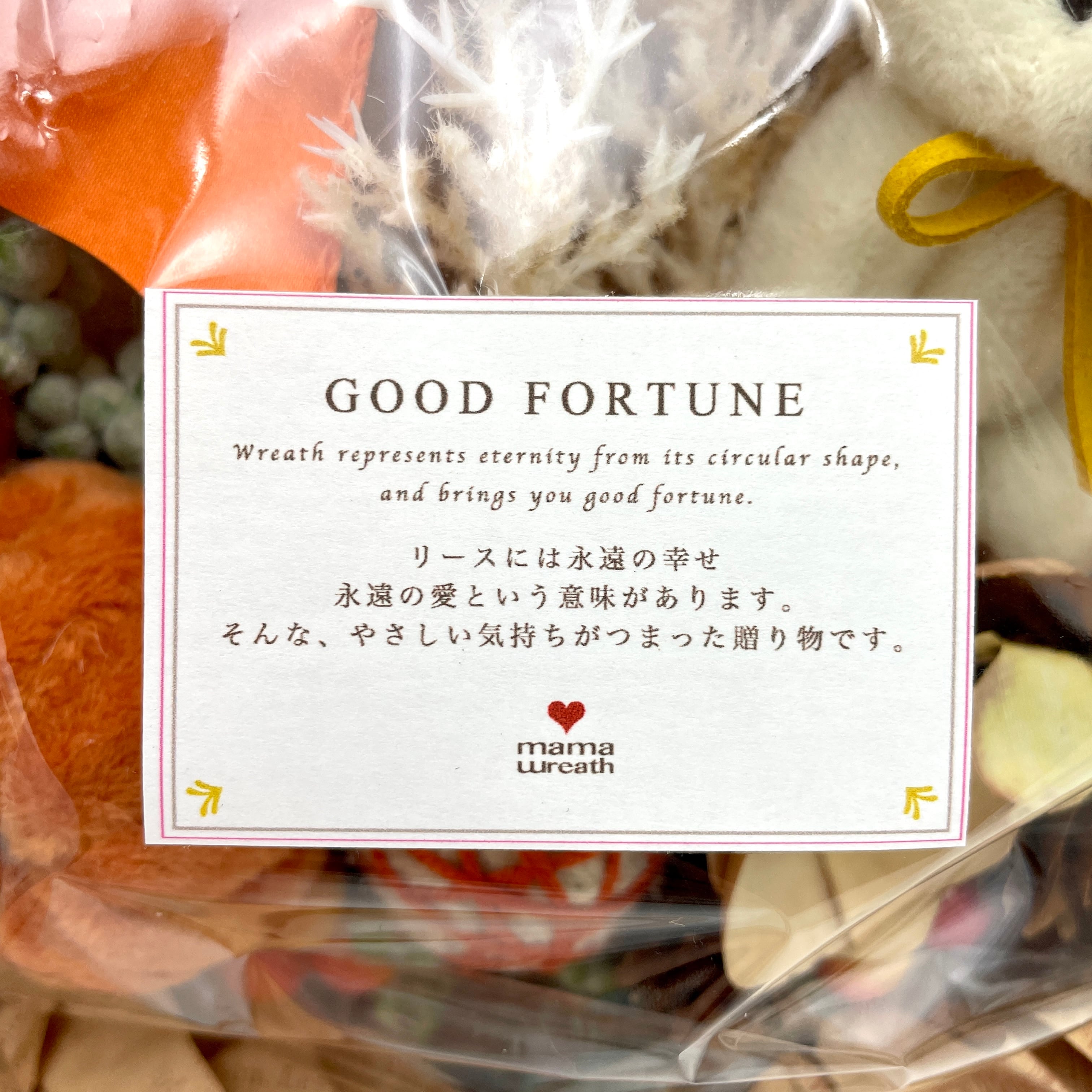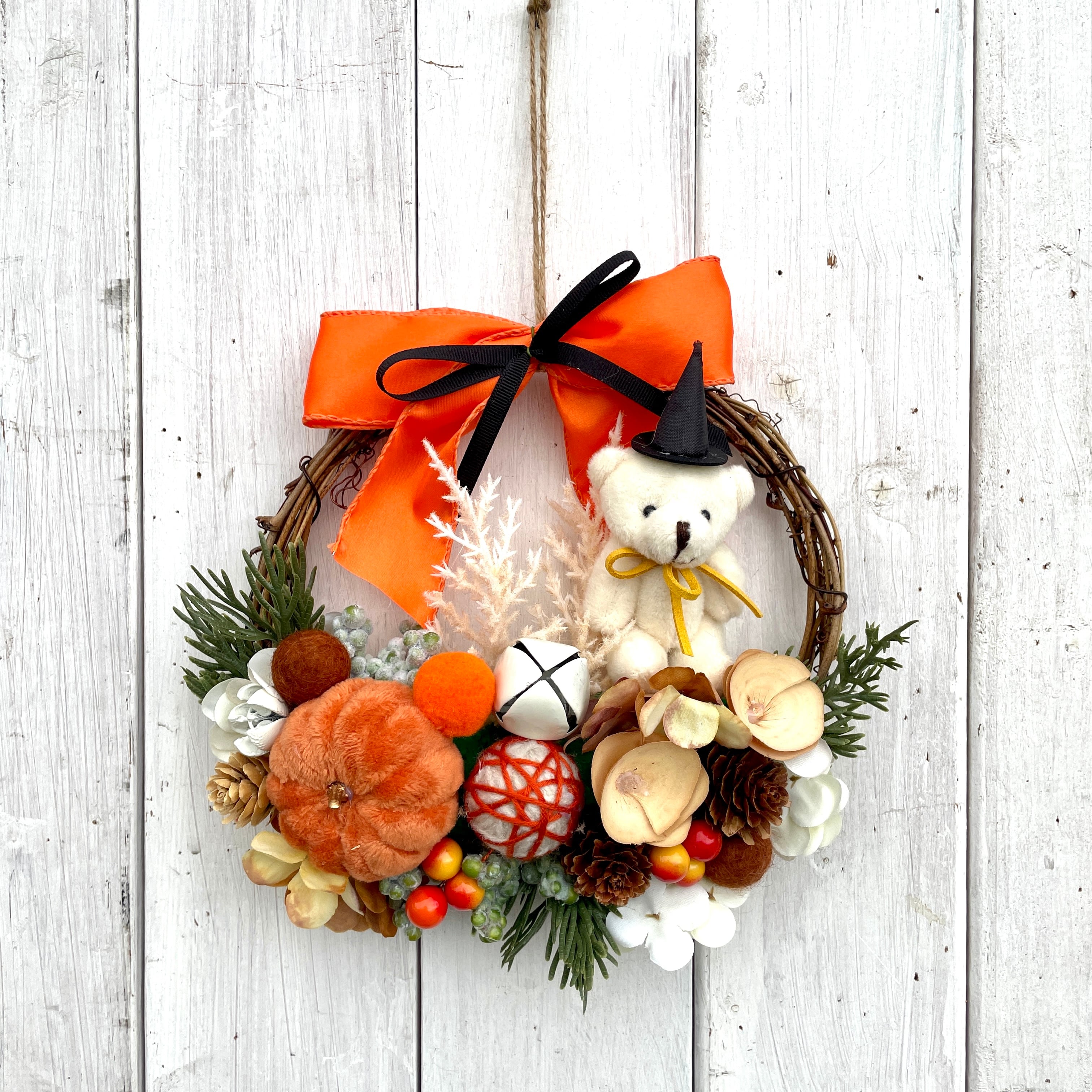 オレンジ色のリボンと、コロンとしたモール生地のパンプキン、そしてとんがり帽子をかぶったクマちゃんマスコットが強烈に可愛いハロウィンリースです。