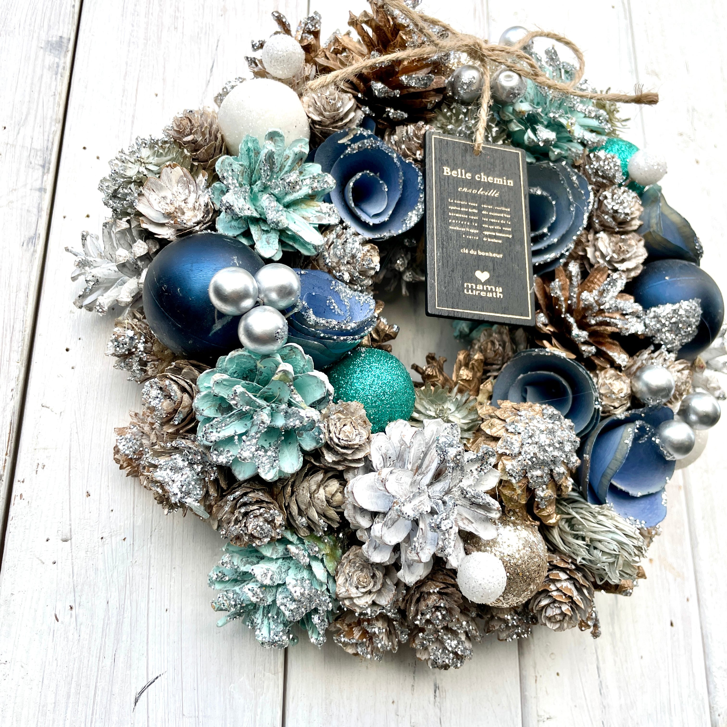 クリスマスリース シルバーラメ ブルー クリスマスボール 松ぼっくり ナチュラルリース 冬 フラワーリース ドライフラワー 青色 水色 【WR-54-B】